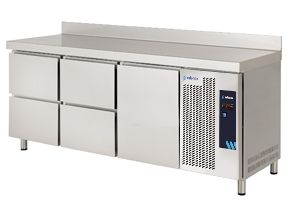 Encimera en acero inoxidable satinado AISI-304 18/10, con canto delantero curvo y peto trasero sanitario de 100 mm.